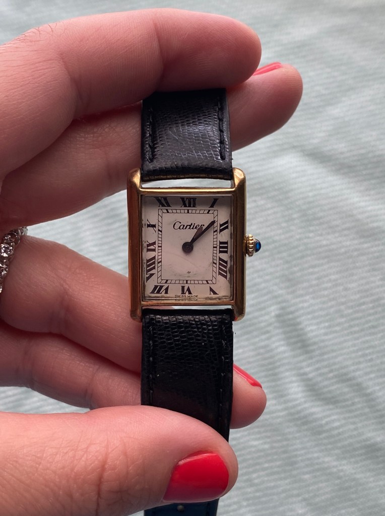My grandparents retired to a senior community in Miami Beach, Florida in the 1970s. When my dad was visiting them many years ago, he found this women’s Cartier Tank, with a gold case and black leather strap, lying in the middle of a desolate sidewalk, baking in the sun, and brought it home: