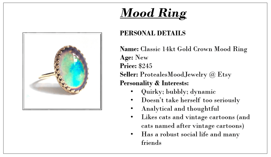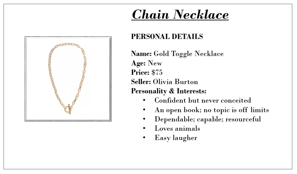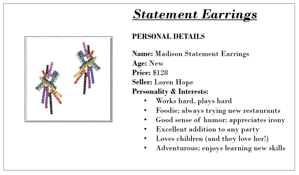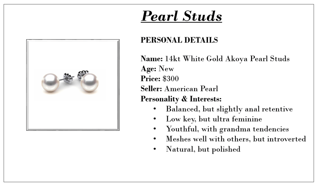 To facilitate this intellectually challenging and high-brow thought experiment, I asked friends and family to identify what type of jewelry best reflects their personality and why. I loved the answers I received from my network. It inspired me to create the imagined biodata below, some of which reflect my friends’ answers (you know who you are :)). Full disclosure: one of the biodatas is my own jewelry alter ego…